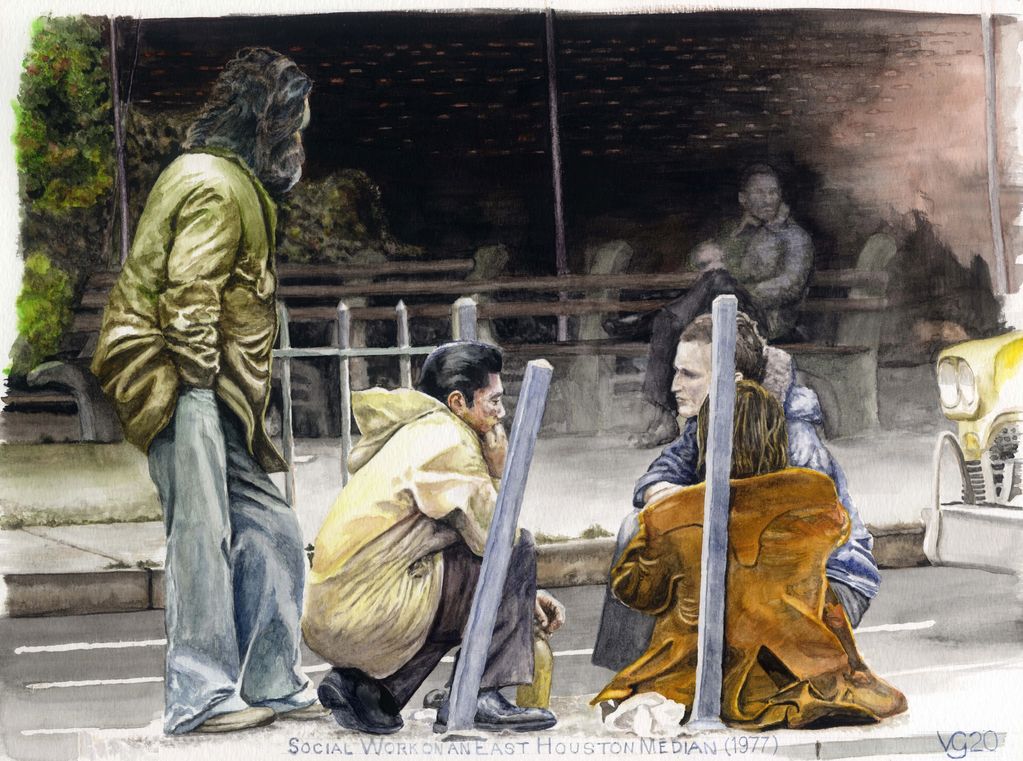 The source for this watercolor is a favorite black and white photo that I took on East Houston Street in NYC in 1977, while a student at Pratt. I had encountered this impromptu counseling session on the median, and  found it to be a very compelling and powerful image.